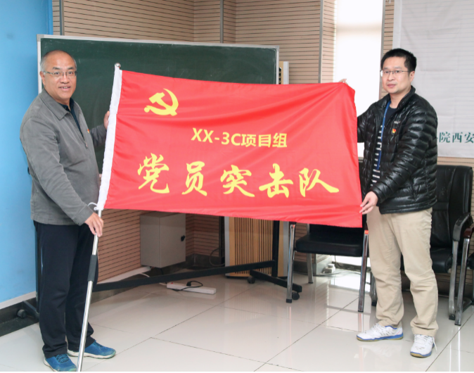 支部大會上謝梅林書記向廣大黨員宣貫主題活動實施規(guī)劃、口號和目標,向突擊隊員和先鋒隊隊員提出了明確職責要求。本次活動的口號:“攻堅克難力踐四個國家,凝心匯智盡展黨員風華”,時間從3月25日開始到項目交付結束,號召大家在科研實踐活動中對標中科院對全體科研工作者“四個國家”的定位和要求,讓黨旗在科研一線高高飄揚。為對本次活動進行廣泛宣傳和對參與隊員進行精神激勵,以及自覺接受廣大黨員群眾的督導,兩個項目的調試現(xiàn)場和研究室宣傳欄均進行了黨旗、隊旗和宣傳標語布置。